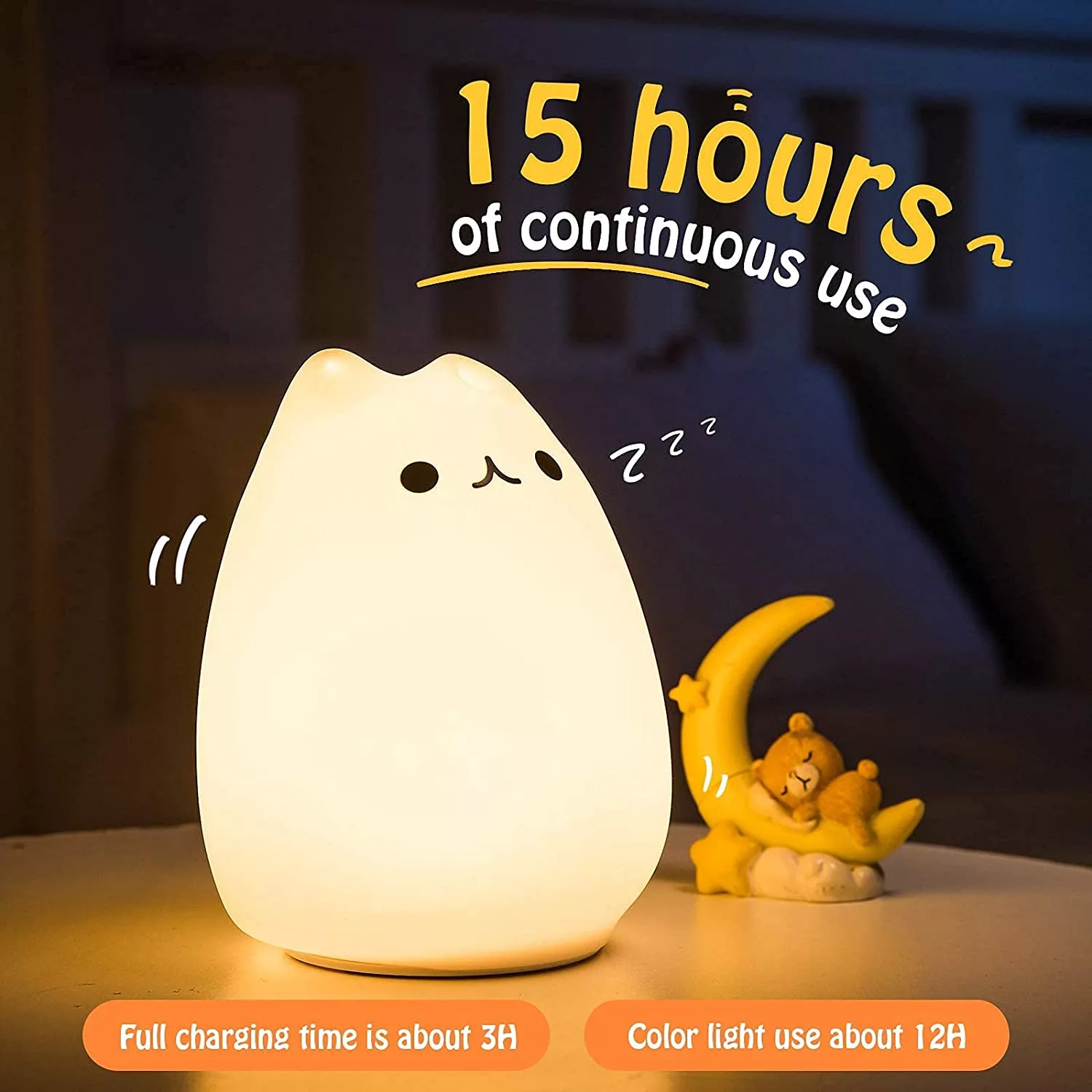3) ALL NIGHT MATE: Built-in 1200mAH lithium battery supports portable usage up to 15 hours with one full charge((5V/0.5A) takes about 3 hours). With soft warm/white light, it brings perfect lighting for your beloved ones, lovers, children, baby, adults, girlfriend all night long.