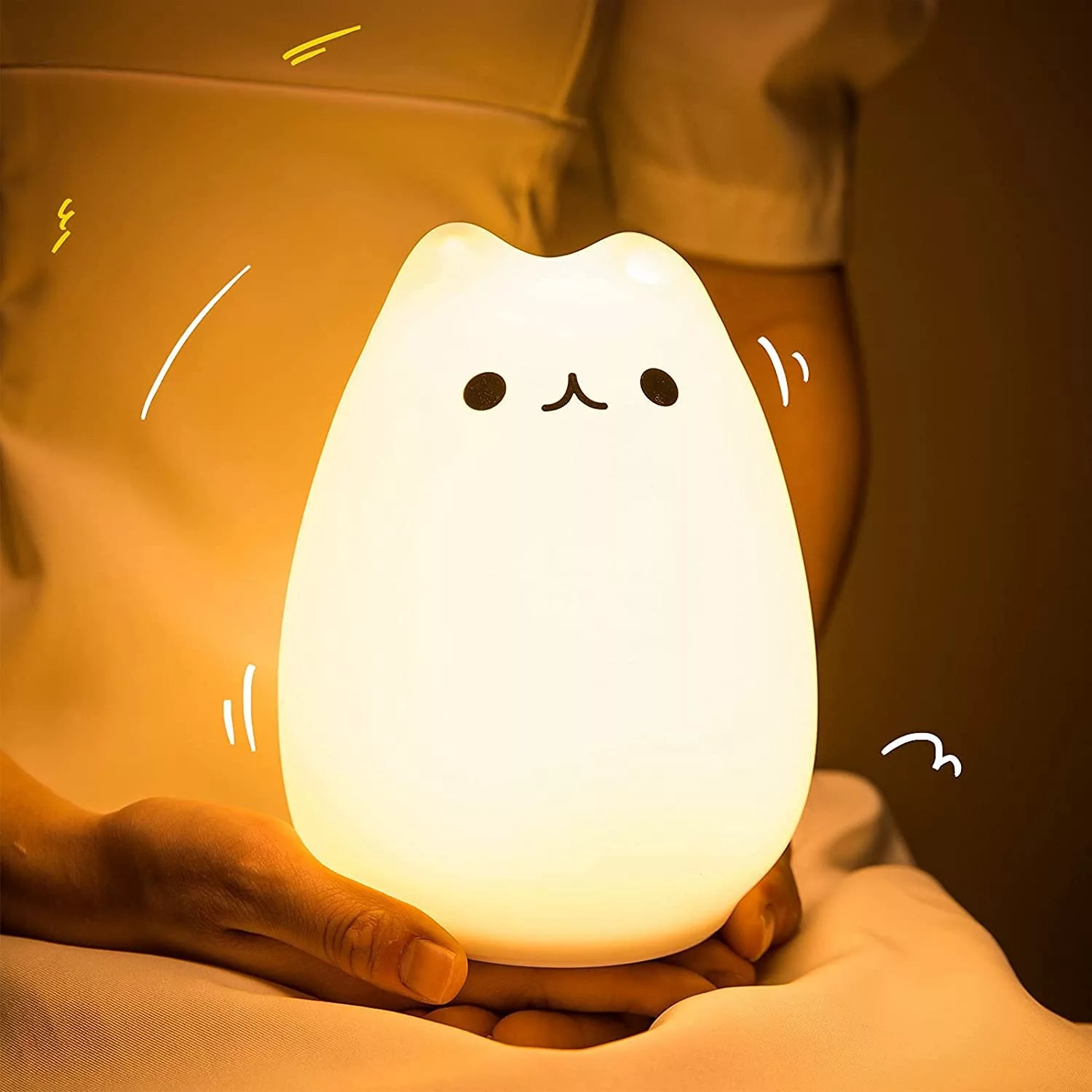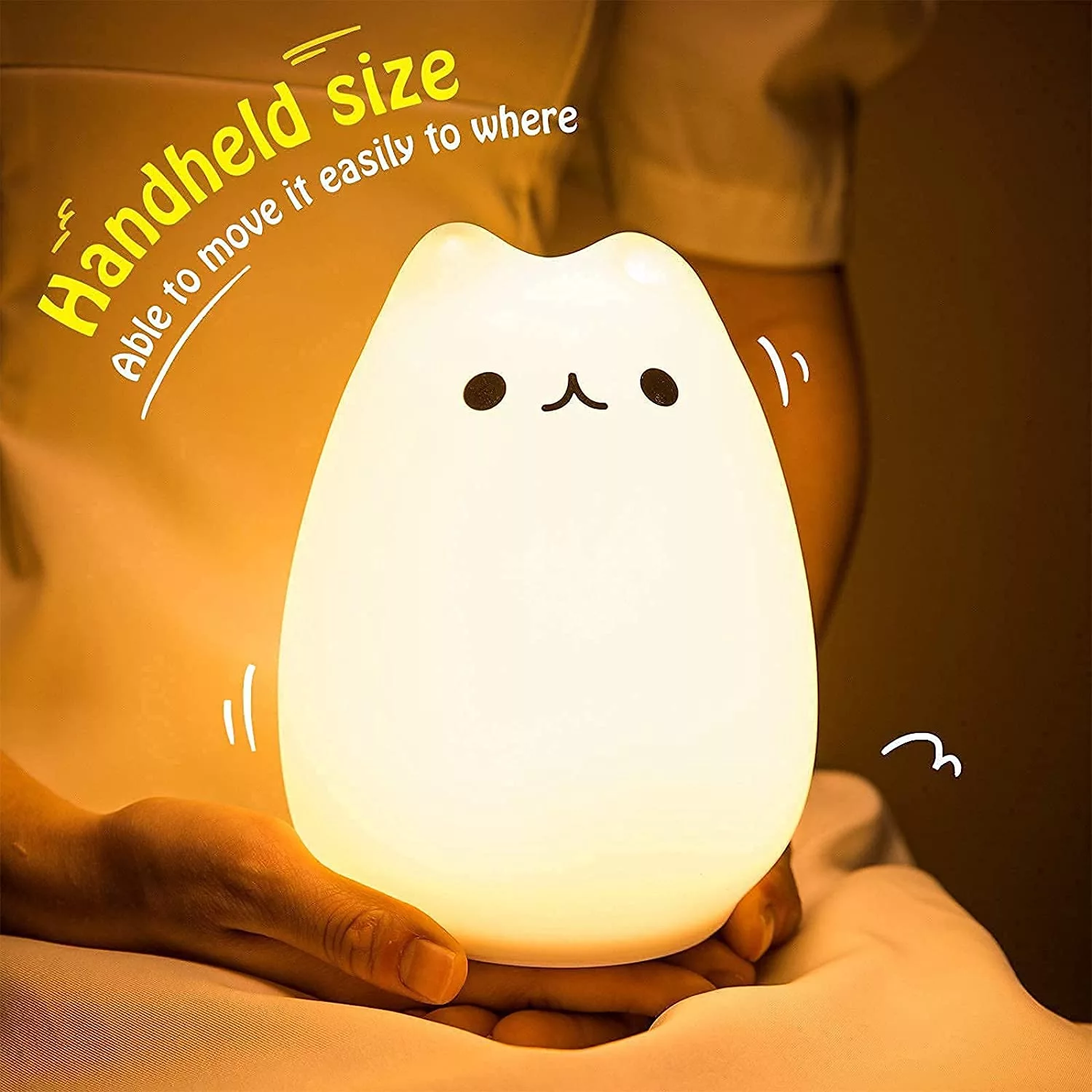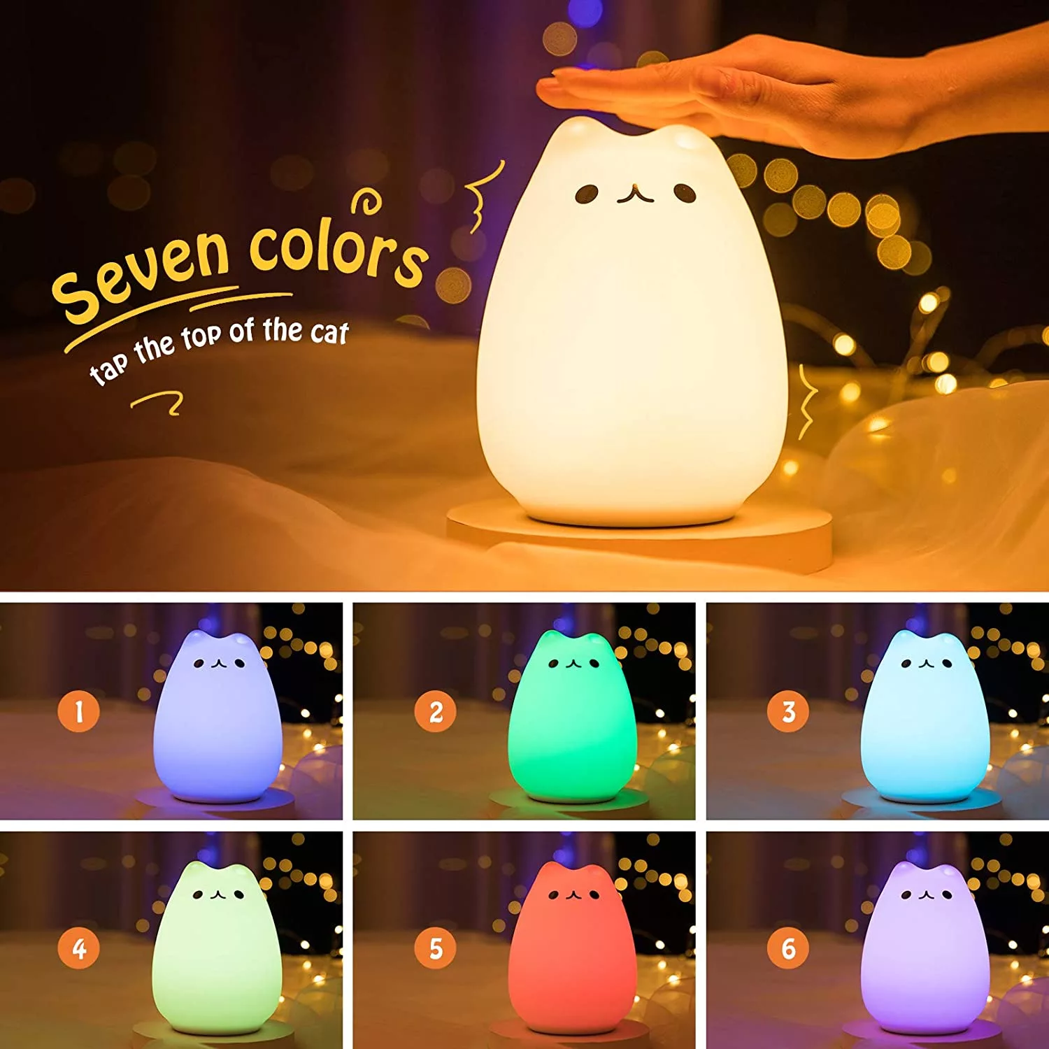 2) TAP CONTROL&DUAL LIGHT MODES: Children/Lover’s Night Lighting, Tap the soft silicone surface to switch among normal WHITE/WARM light mode, 7-color breathing light mode and standby mode, making it a romantic sweet nursery baby night lamp companion and it is easy to use as Bedside night lights.